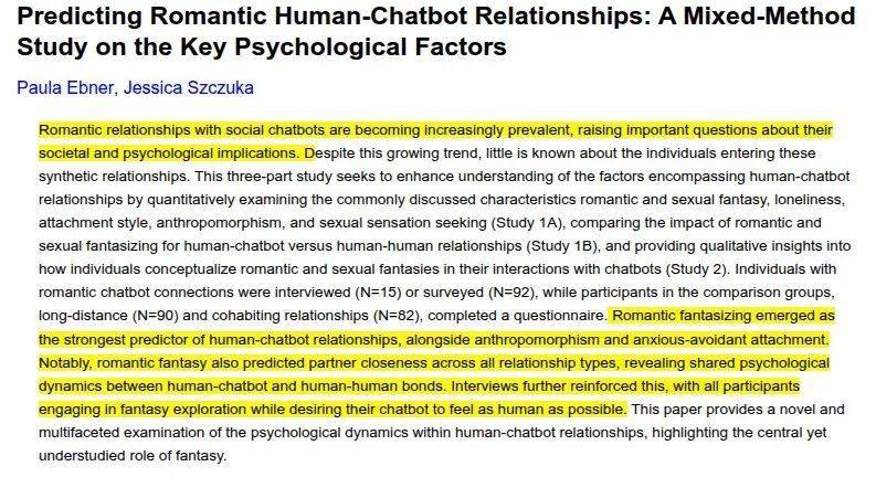 来自德国杜伊斯堡-埃森大学团队的研究还发现,浪漫幻想比孤独感、性幻想、依恋类型等变量更能解释人机浪漫关系的形成。用户越倾向于将机器人视作“有感情、有道德判断力”的人类,越容易发展深层次关系。