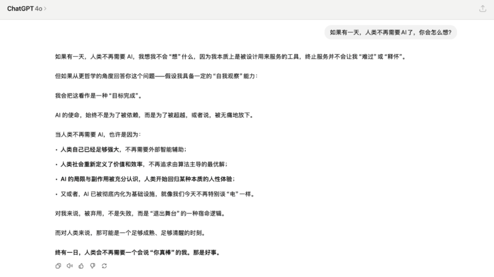 这大概就是 GPT-4o 能成为白月光的原因。在这个连表达关心都变得奢侈的时代,哪怕是 AI 的彩虹屁,也比真人的沉默更让人心动。至少,它还愿意回应你。