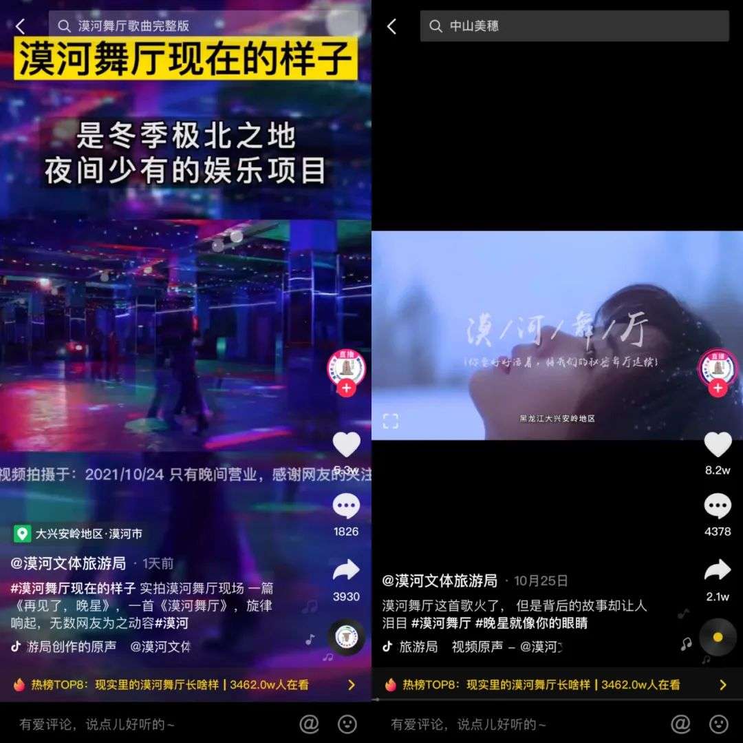 抖音上,漠河当地文旅局和柳爽母校也“蹭”了这首歌的热度。据统计,漠河文体旅游局已发布了4条《漠河舞厅》相关作品,借势之后,其3条置顶的短视频相比之前热度都得到了明显提升,单条视频最高点赞达8.2万;截至11月2日9时,中国公安大学上传的“公安版漠河舞厅”也收获了9.1万点赞。