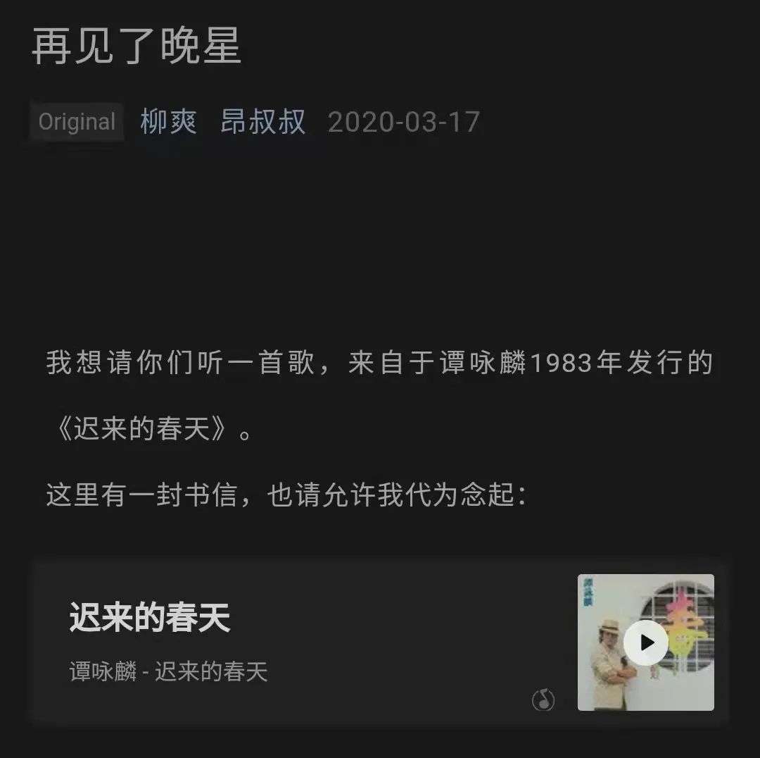 歌曲走红后,柳爽此前以张德全老人的口吻写给“妻子”康氏的信《再见了晚星》也被翻了出来,不少人被“晚星痴迷四下无人的夜宇,不肯倾诉光顾星球的原因”的细腻笔触所打动。