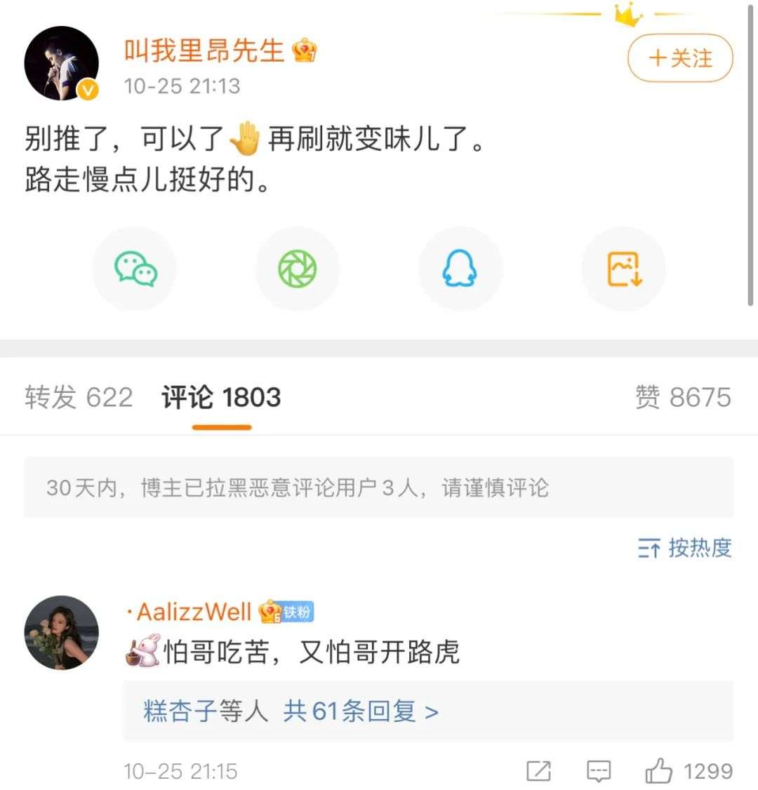 在10月25日,柳爽发了一条微博:“别推了,可以了,再刷就变味了。路走慢点挺好的。”热评第一名话糙理不糙,“怕哥吃苦,又怕哥开路虎”,可谓是原生歌迷们矛盾心理的真实写照。