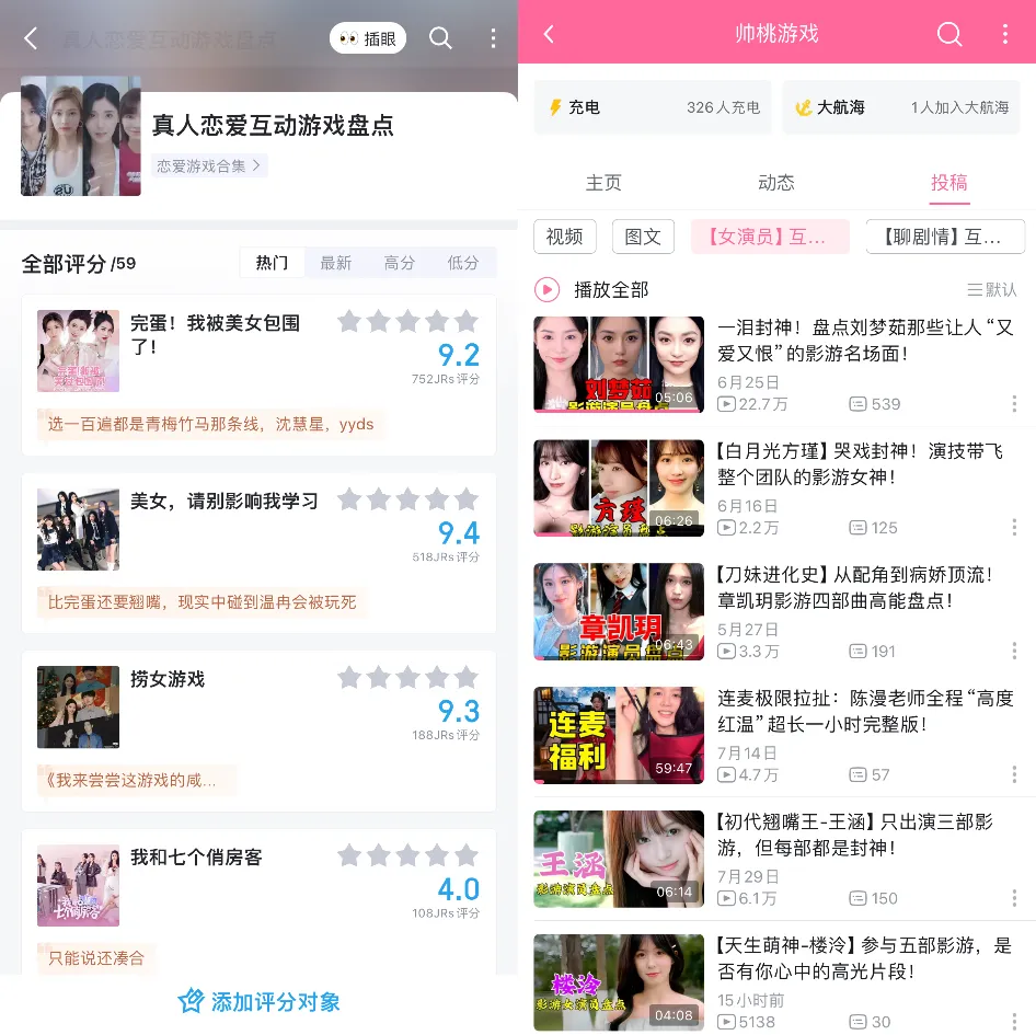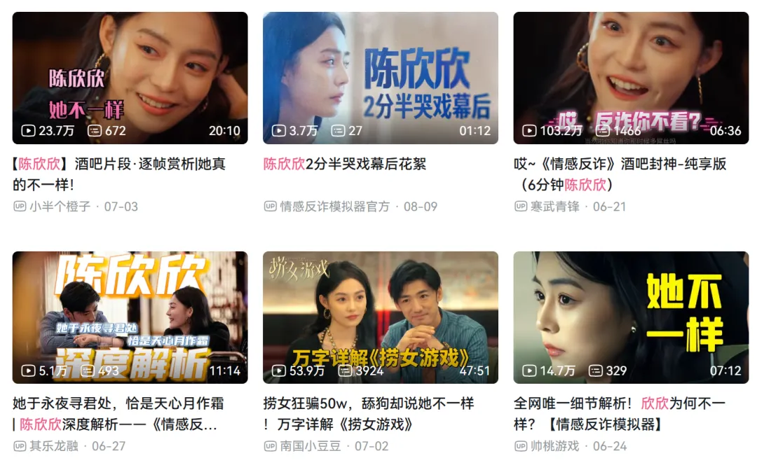 上游不会无缘无故加码,能够如此内卷、如此专业,也得益于下游形成了稳定的影游消费群体。长剧有内娱,短剧有短娱,而如今,以男性为主的“影游娱”也默默成型,出现了影游排雷种草、资讯播报的垂直UP主,也有女演员在这里涨粉、深耕,形成近乎断层的号召力。