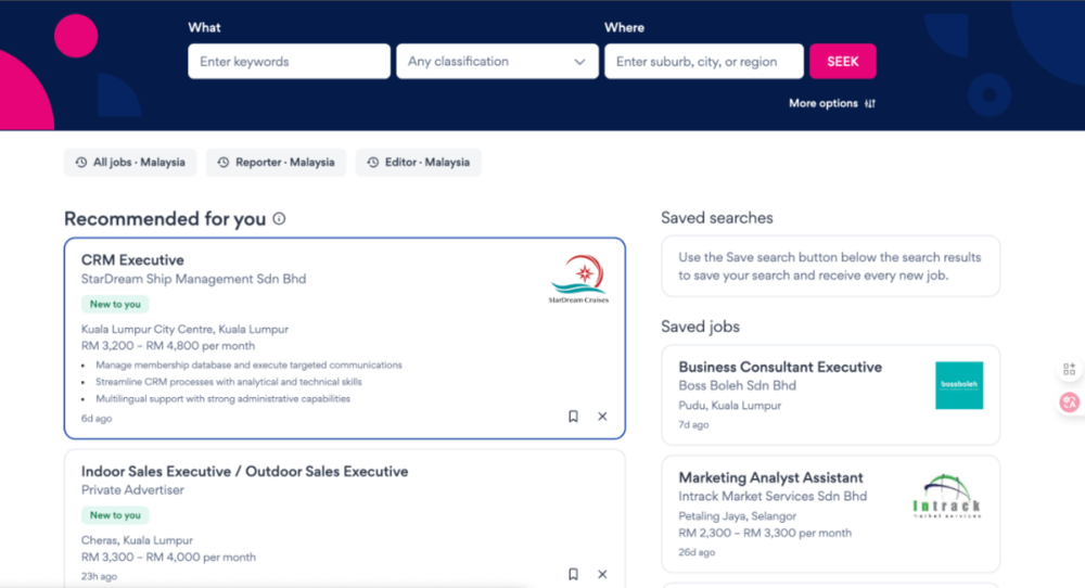 以马来西亚为例,这边主流的招聘渠道是job street,也是全马最大的综合类招聘平台。它的界面和传统的招聘网站区别不大,有些类似boss直聘,区别在于,它不是以牛皮癣广告位为主,而是以搜索+岗位为主,我截取两者的首页招聘,大家就可以一目了然。