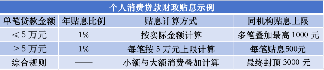 有关贴息的具体规则,财政部金融司司长于红在发布会上进行了详细的介绍:对于单笔5万元以下的消费,按照实际金额计算贴息,多笔叠加以后,在同一家贷款机构最高可以享受贴息1000元;对于单笔5万元以上的消费,以5万元为上限来计算贴息,也可以多笔叠加,加上小额消费的贴息以后,在同一家贷款机构最高可享受贴息是3000元。