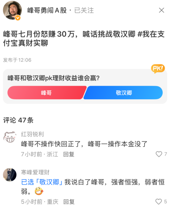 这次峰哥不但说快要回本了,还跑去支付宝做起了财经博主。