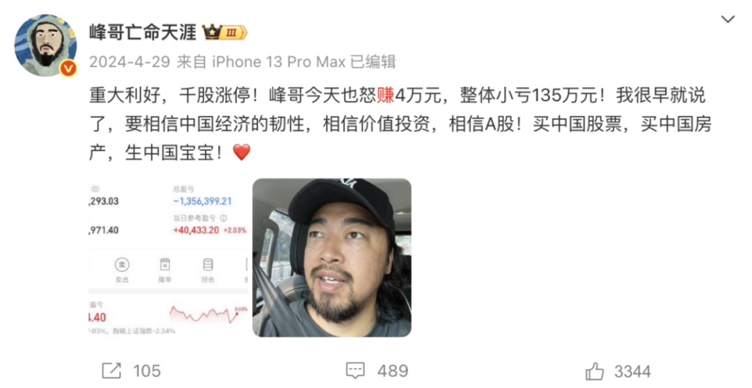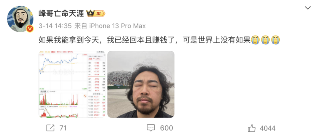 “这次峰哥没操作都回本了,稍微操作一下,估计本金都没了。”