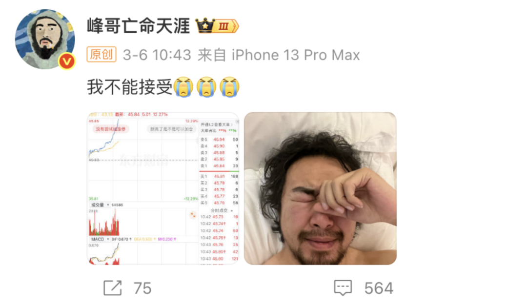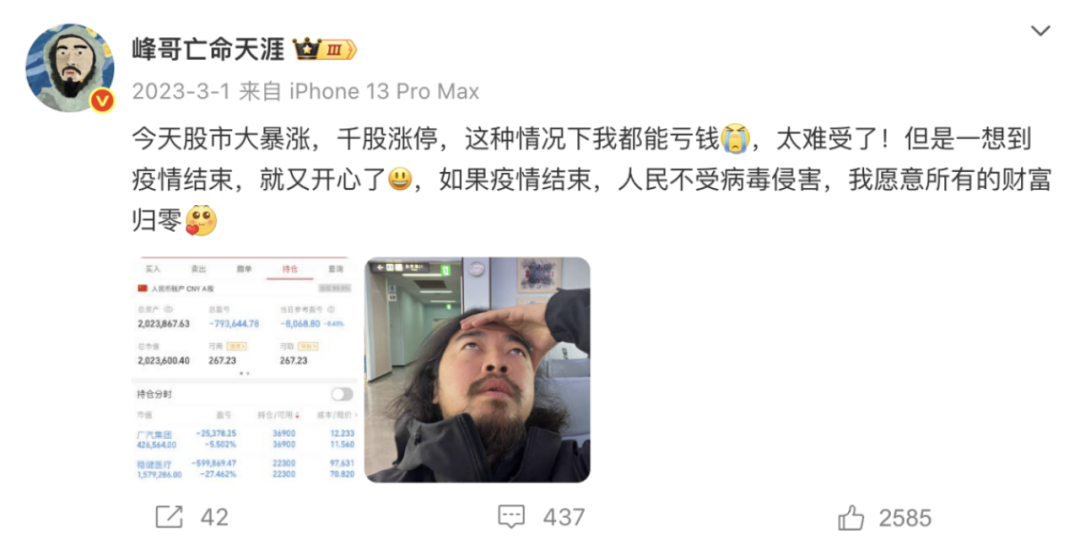 在那些不堪回首的日子里,A股的普罗米修斯·峰哥把自己的苦难变成众人的乐子,在直播间里贡献了多种才艺,包括鬼哭狼嚎、心脏骤停、呼吸不畅。