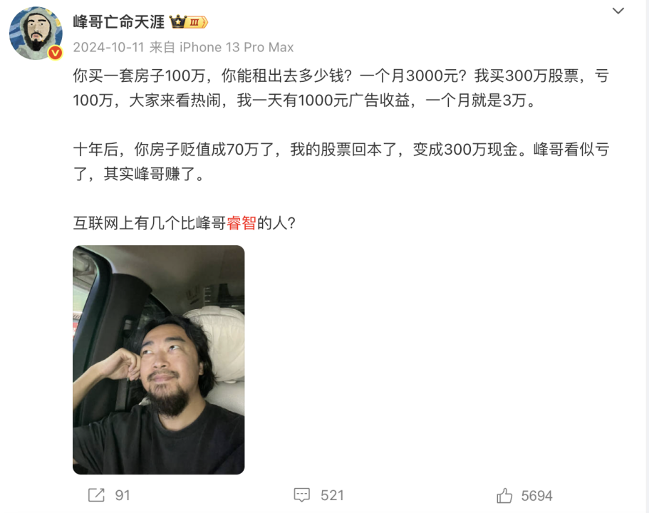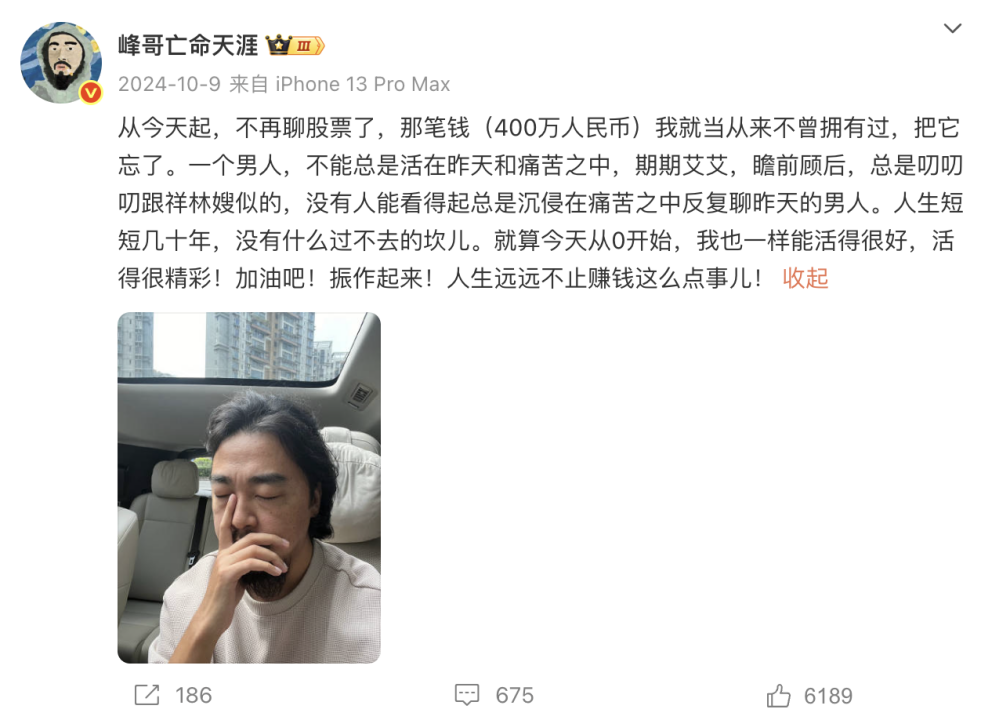 2024年10月9日,A股暴跌近万亿,峰哥在微博发表重要讲话:完了完了完了。