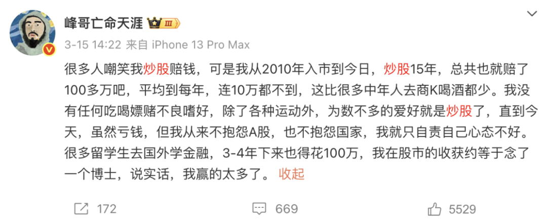 峰哥主张“价值投资”,声称自己从未“炒股”。从来没“炒”过,何谈亏本呢?