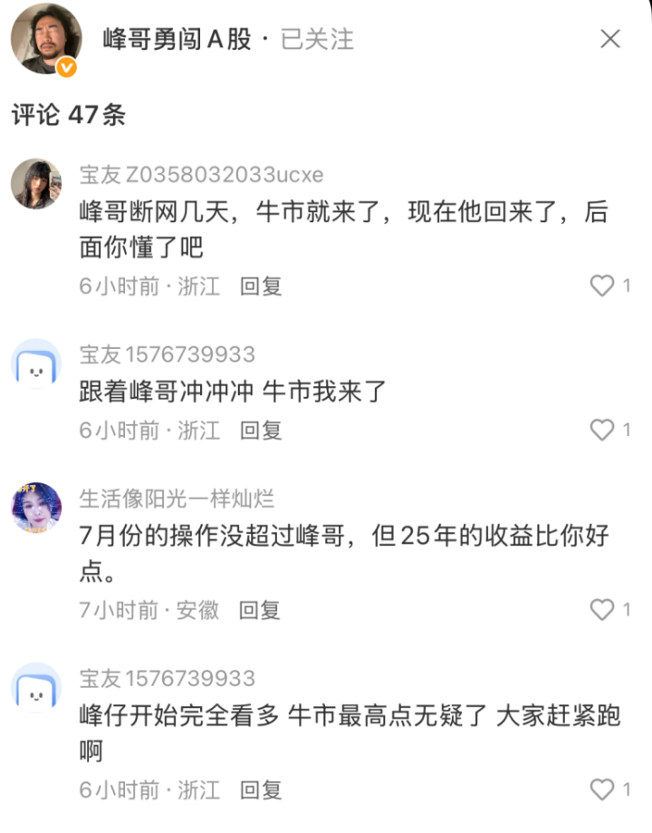 b友们只需要熟记一条黑暗法则:峰哥断网三天,牛市就来了;峰哥看多的时候,基本上大家就该跑路了。