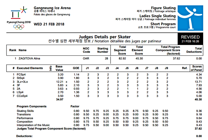 平昌冬奥会女子单人滑短节目项目打分表,图源:知乎