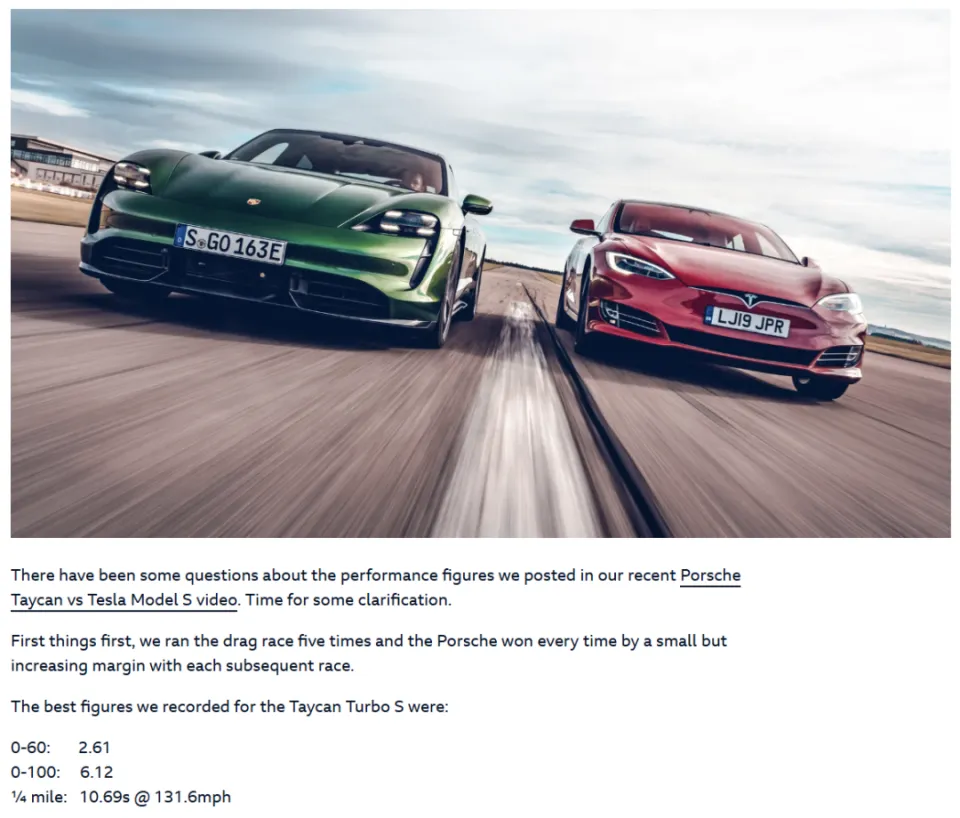 2019年10月,《Top Gear》制作了一期喜闻乐见的双车对比视频,主角是保时捷Taycan Turbo S和特斯拉Model S Performance。