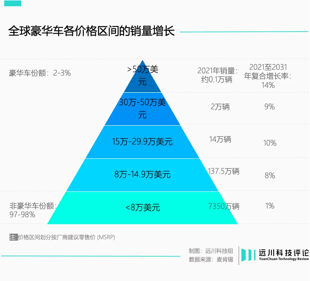 但这样的品牌定位是把双刃剑。按照麦肯锡对豪华车市场的四级划分[7],保时捷的走量车型处于一级,最接近大众市场,竞争更为激烈,也意味着更容易被电动化误伤。