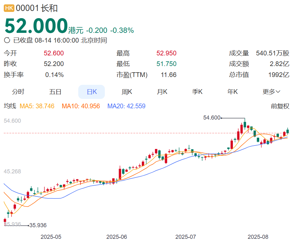 今年以来,长和股价持续上涨,截至8月14日收盘报52港元,年内已涨超30%,总市值近1992亿港元。