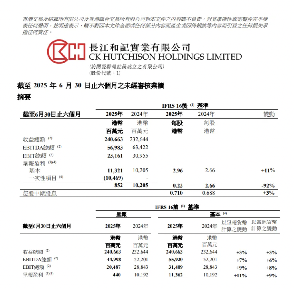 8月14日,李嘉诚旗下长和发布上半年业绩。截至2025年6月30日止六个月,呈报盈利113.21亿港元,同比增长11%。每收入总额2406.63亿港元,同比增长3%。EBITDA总额569.83亿港元,同比下降9%。