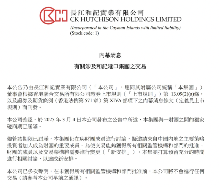 7月28日,长和发布公告表示,公司确认,于2025年3月4日发布公告中所述,集团与一财团之间的独家商期已届满。尽管该期限已届满,集团仍在与财团成员进行讨论,拟邀请来自中国内地之主要策略投资者加入成为财团的重要成员。为使交易能够获得所有相关监管机构和部门的批准,财团的成员以及交易架构将需要进行变更(“新安排”)。集团打算预留充分的时间进行相关讨论,以达成新安排。