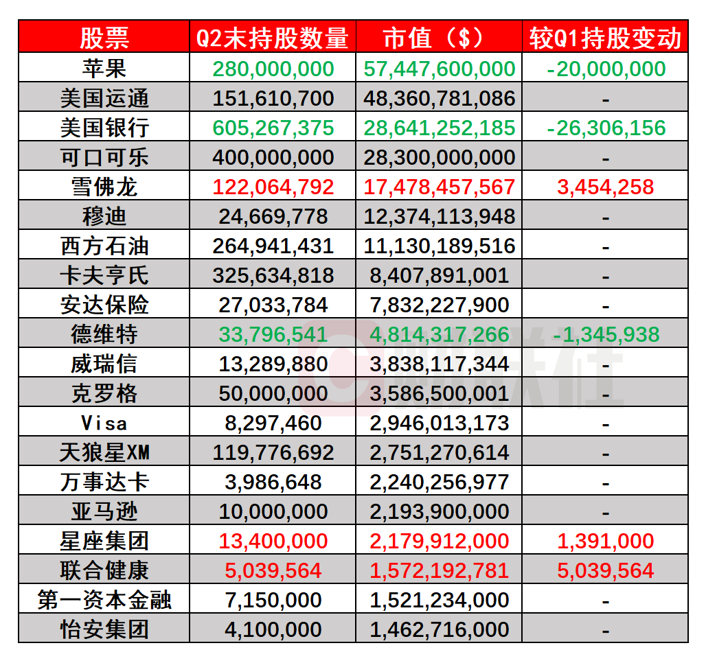 (伯克希尔Q2持仓前20个股,来源:SEC、WhaleWisdom)