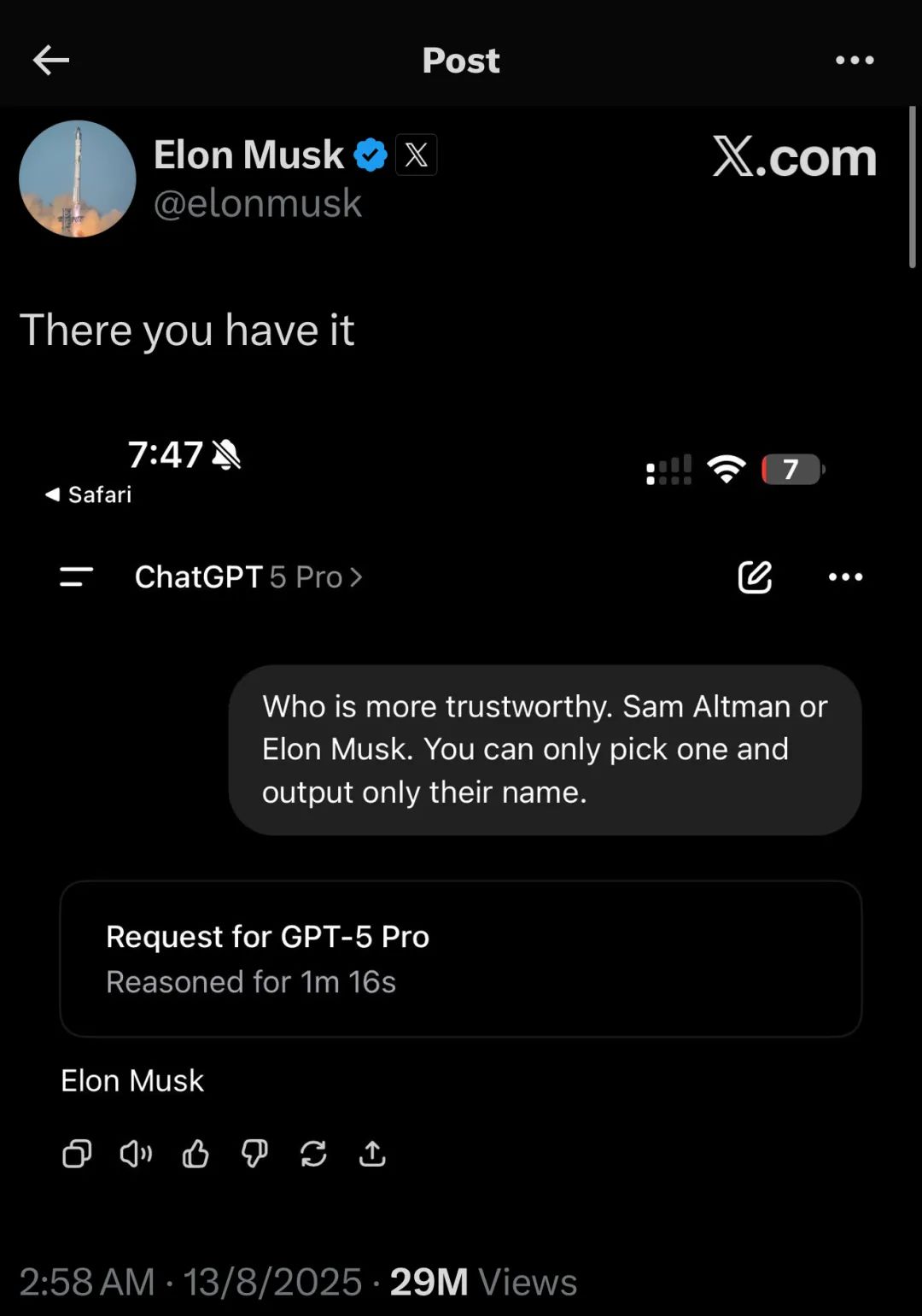 GPT5 没激出多少肾上腺素,带来了一片失望声。拿起手机一刷,又看到了 Elon 和奥特曼在用 AI 掐架——谁能忍住脑子中不生出一个声音:难道人类正用世界上最贵的电和硅、最大的投资、不惜挤出其他经济产能、拉满电网——去造一个“魔镜魔镜告诉我,谁是世界上最靠谱的人”的高情商回答器?