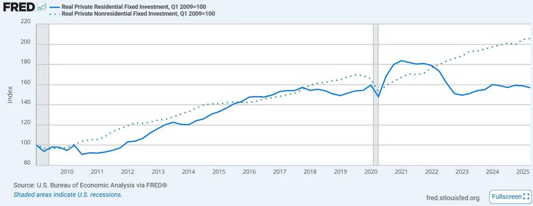 “私人住宅固定投资”和“私人非住宅固定投资”(包含厂房、数据中心等)疫情后开始大分化,与“挤出”叙事相符:非住宅(数据中心等)强劲扩张,而利率敏感、同样需要资源的其他建设被压制(图4)。
