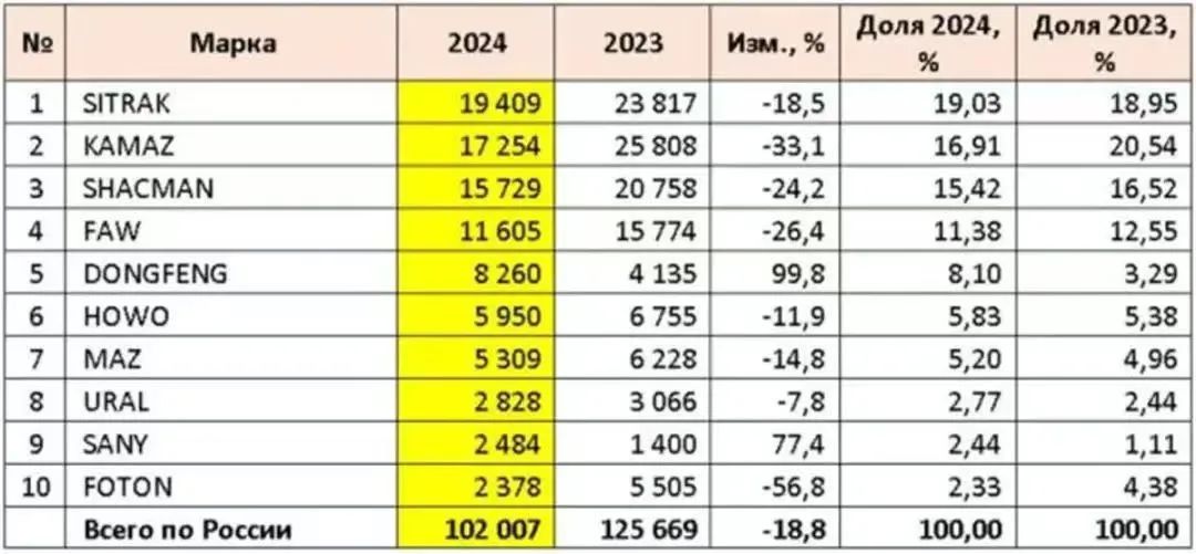 ▲2024年俄罗斯市场重型卡车销量排名前十,有七席被中国车企占据