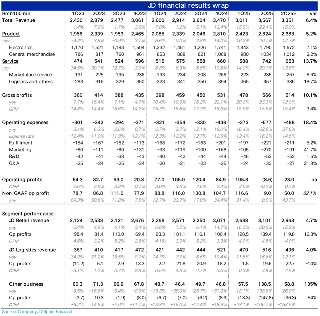 1. 收入大beat,利润大miss:整体大数上,本季京东总营收同比大增22%,远高于市场预期的15%,实际营收比预期高出近220亿。