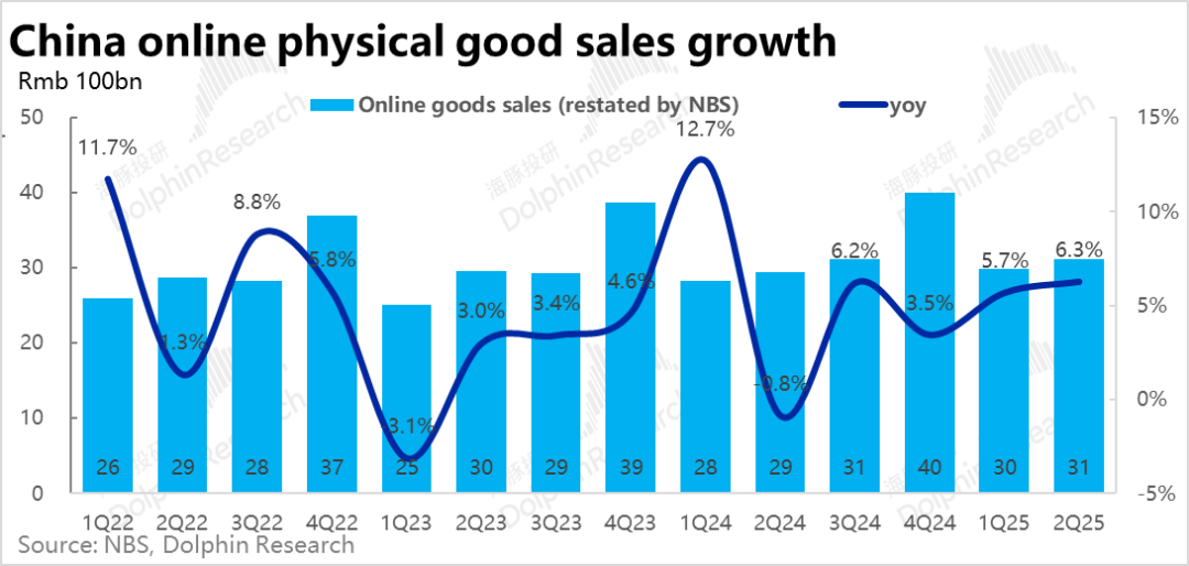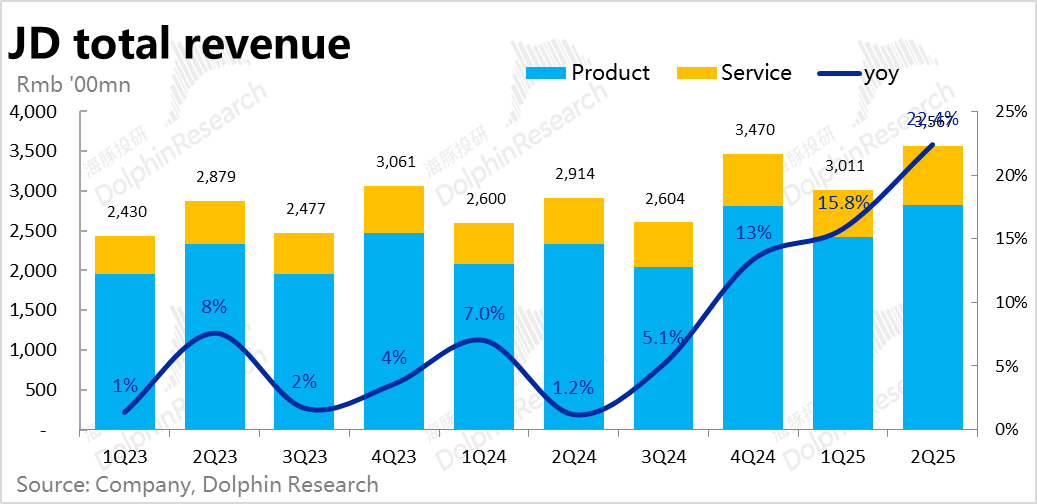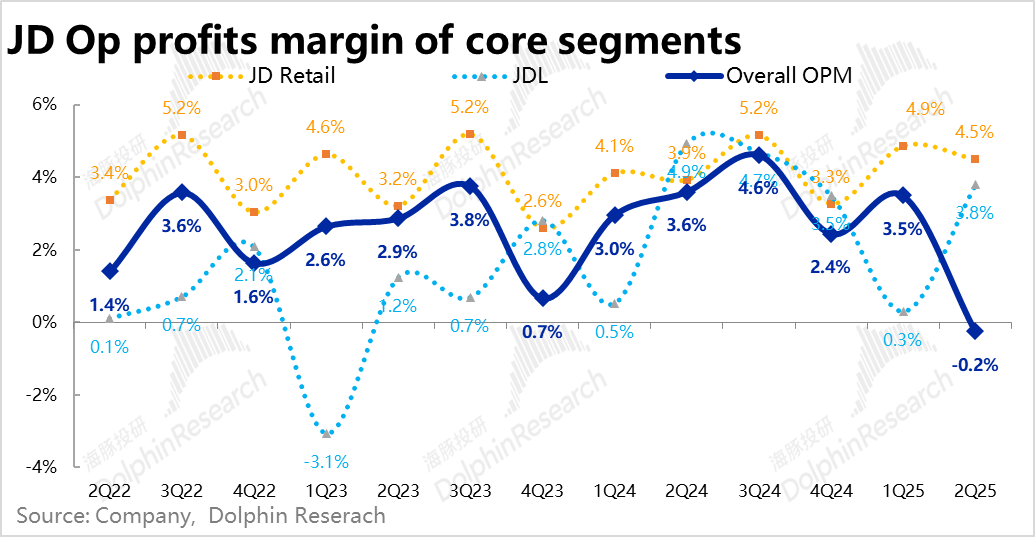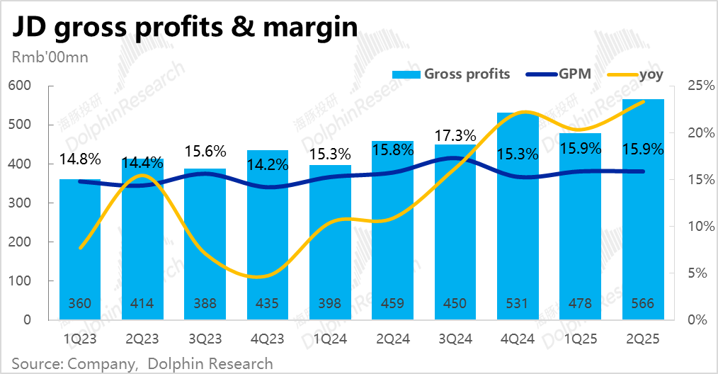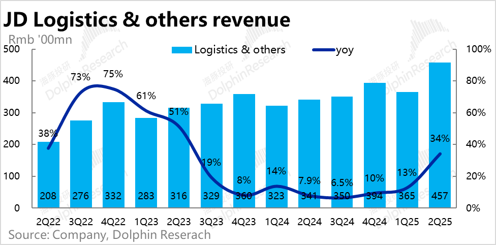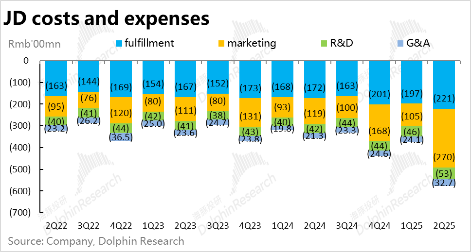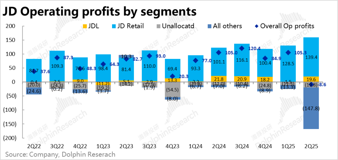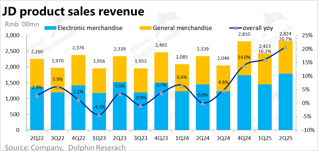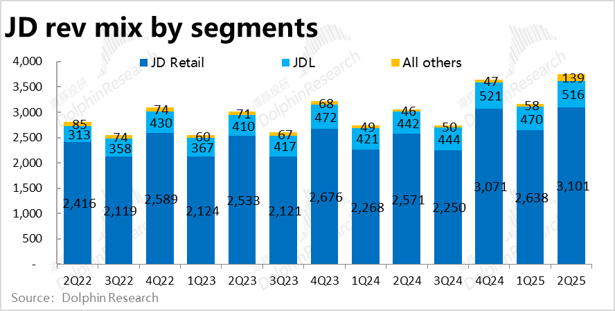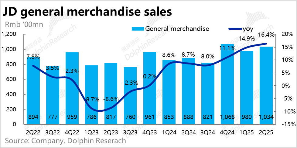在以国补利好为主,可能也夹带有限外卖交叉销售的利好下,京东核心主业——商城业务本季的增长可谓大超预期的强劲,远跑赢行业大盘的增长。