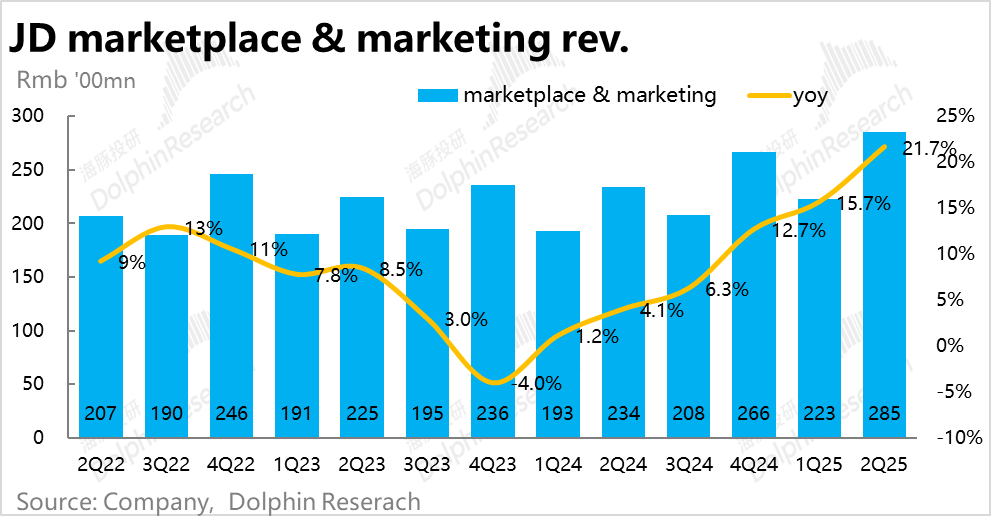 2. 平台服务收入:面向3P卖家的佣金和广告业务,在自营业务不俗增加的带动下,本季营收增速也环比拉升了6pct到近22%,稍稍跑赢自营收入增速。可见京东商城本季的整体流量确实有不错的增长,即便这可能主要是国补的扩散效应。