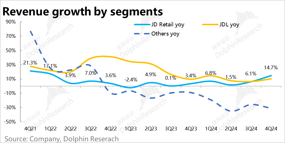 1. 核心业务——京东商城营收同比增长20.6%,远超预期15%的增速,主要是受国补利好下通电产品带动,以及其外溢效应。