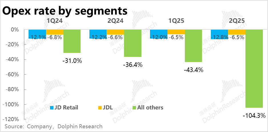 分板块看,有趣的是,京东商城本季的经营费用率为12.8%,环比和同比都在走高,即商城板块的支出确实增多了(电商竞争压力仍在)。也暗示外卖的支出中并没太多是从商城板块那腾挪而来,大部分就是净新增的额外支出。