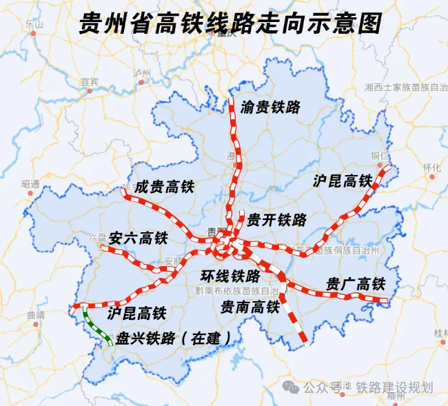 贵州的高铁网络,北连川渝,南通两广,西通云南东南亚,东连长三角,贵阳一跃成为西南铁路新枢纽。