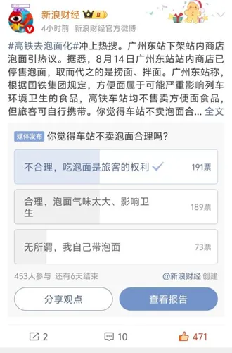 在微博上一则关于“车站不卖泡面是否合理”的投票中,不同意见势均力敌。有42%的网友认为不卖泡面不合理,吃泡面是旅客的权利,有41%的网友认为不卖是合理的,因为泡面气味太大、影响卫生。