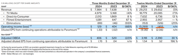 △ 派拉蒙全球2023年亏损4.5亿美元,2024年亏损53亿美元