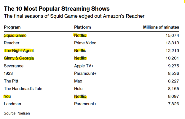 到2025年上半年,最受欢迎的原创流媒体剧集前十中,有四部来自于Netflix,碾压了其它所有平台。