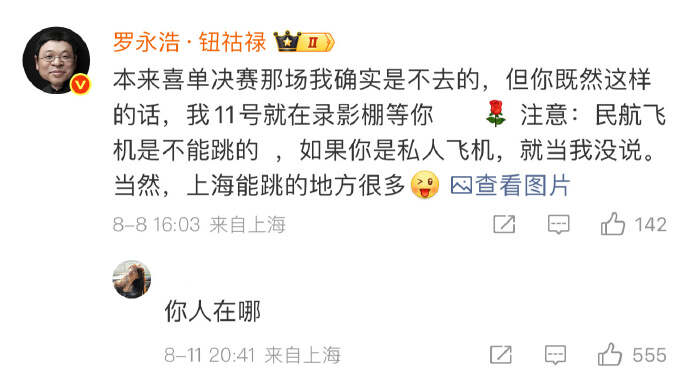 有位网友在微博吐槽,如果在《喜单》决赛现场看到罗永浩就从回程飞机上跳下去。罗永浩为了对呛网友,转发这条微博,表示本来决赛他是不去的,为了这位网友他也要去。