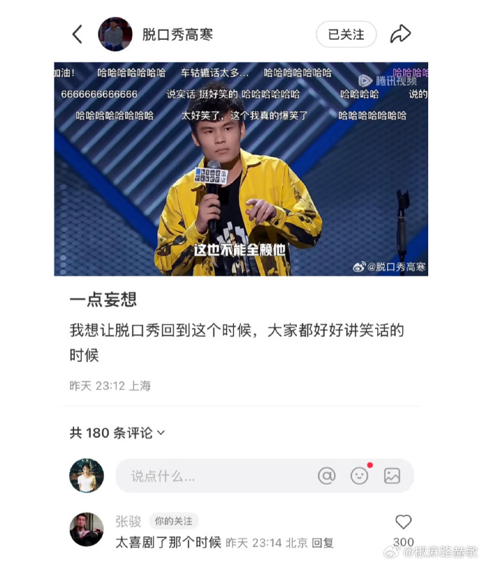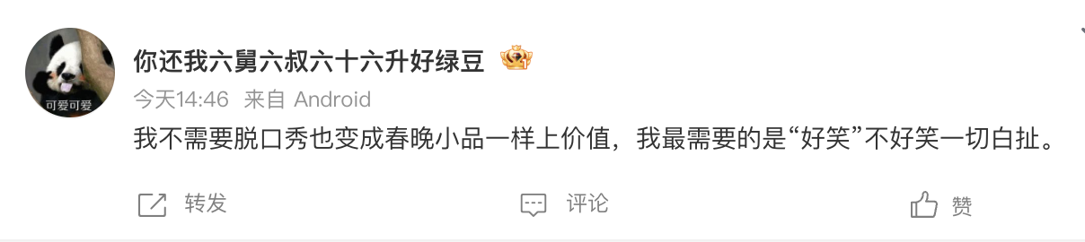 A观众说某个段子不好笑,B观众便会在评论区回怼“那你别看了”;C观众觉得段子太老了,D观众会说“石砸狗叫”“你破防了”。如此循环,社交媒体都快变成围绕脱口秀好不好笑的辩论现场了。