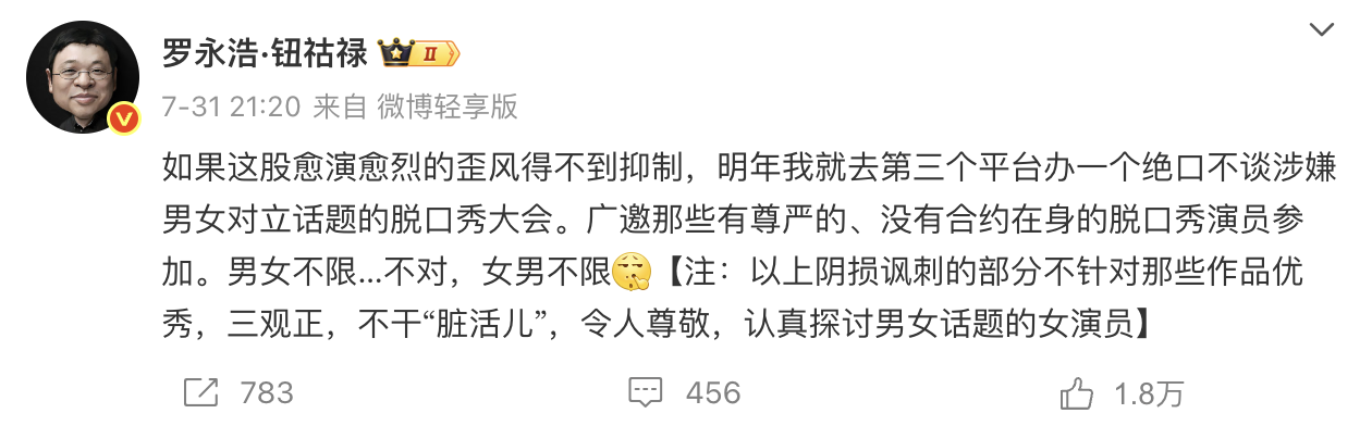 罗永浩的一次老夫聊发少年狂,成为点燃脱口秀性别大战的萨拉热窝。无论站队站在哪一边,不满的人都更加不满。