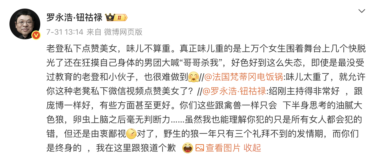 罗永浩先是肯定了张绍刚的专业能力,紧接着锐评素人“卵虫上脑”“只是犯了女人都会犯的错”。并且在后续和网友的对喷中,指出女性对着脱光的男团大喊“哥哥杀我”,“好色好到这么失态,即使是最没受过教育的老登和小伙子,也很难做到”。