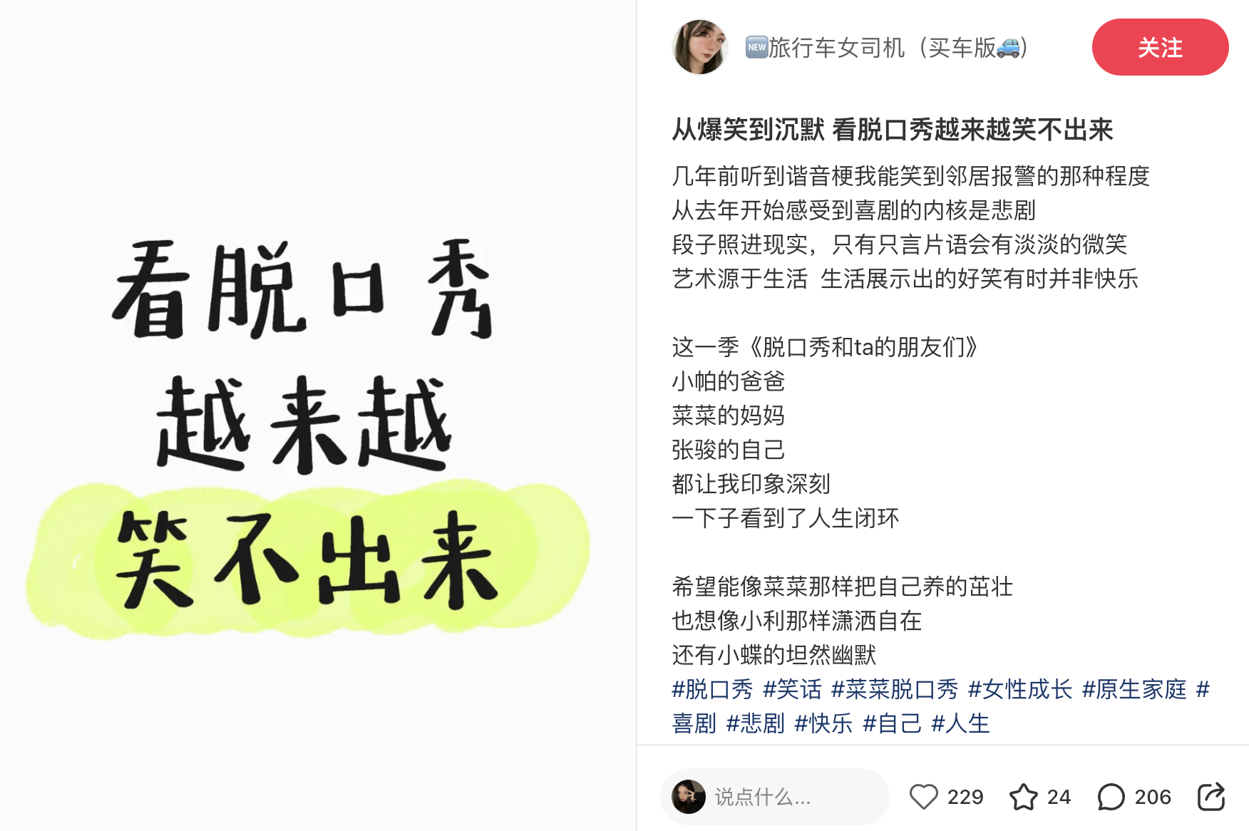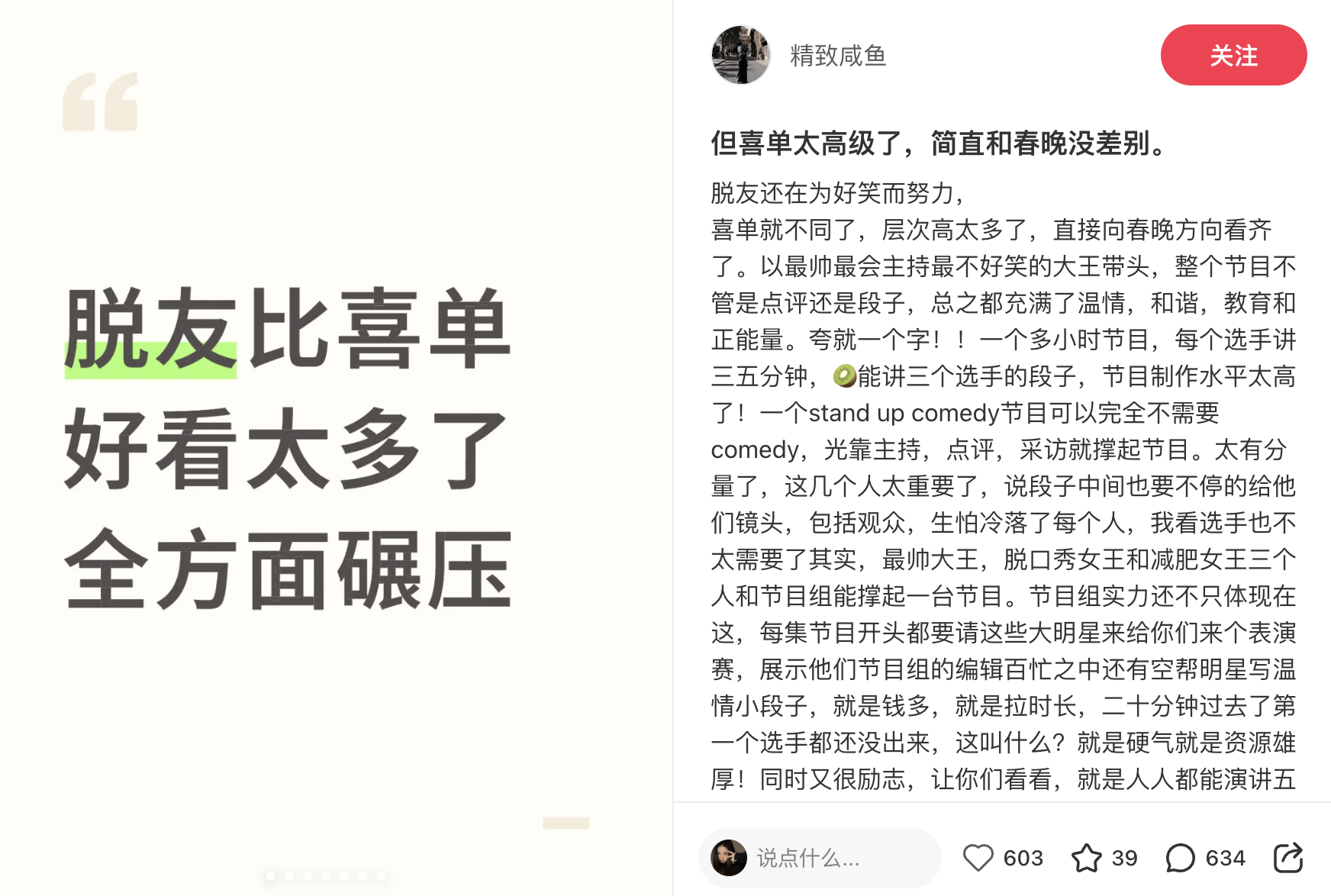 想要表达的观点,盖过了喜剧本身,于是一部分观众有了“被观点绑架”的微妙感,观点是正确的,但好笑与否这件事本身却是主观的。没有任何演员能够绑架任何观众,让ta必须喜欢自己的表演。