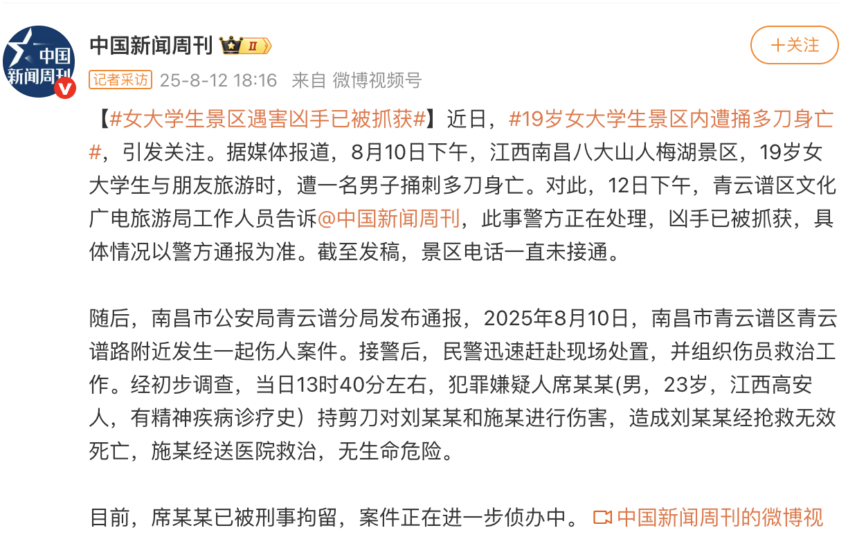 这段话播出之后,点开微博热搜,就能看到新鲜出炉的社会新闻:19岁女大学生景区内被捅多刀身亡,男子有精神疾病诊疗史。