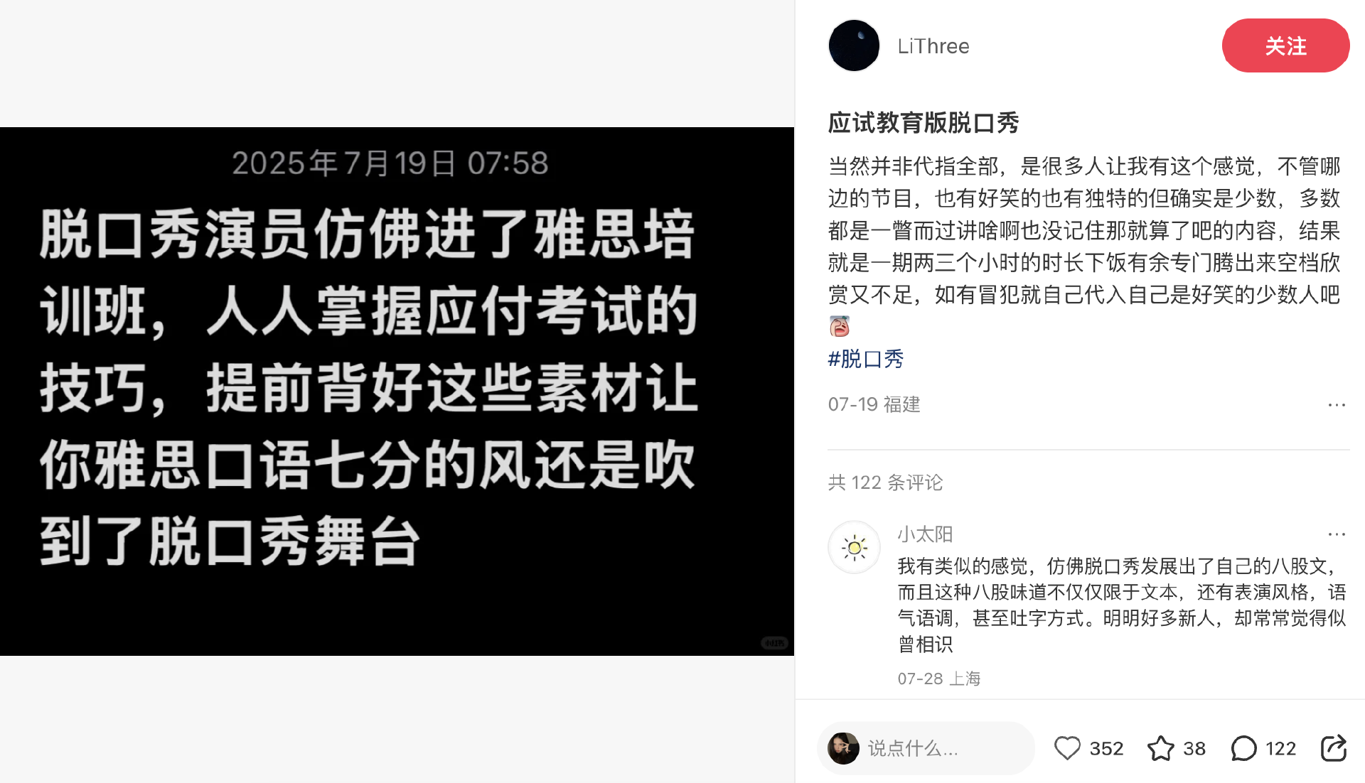 许多脱口秀演员都是带着既定议题上台的,似乎总要教育观众一些东西。脱口秀正在不可避免地走向春晚化,发展出了属于自己的八股文。