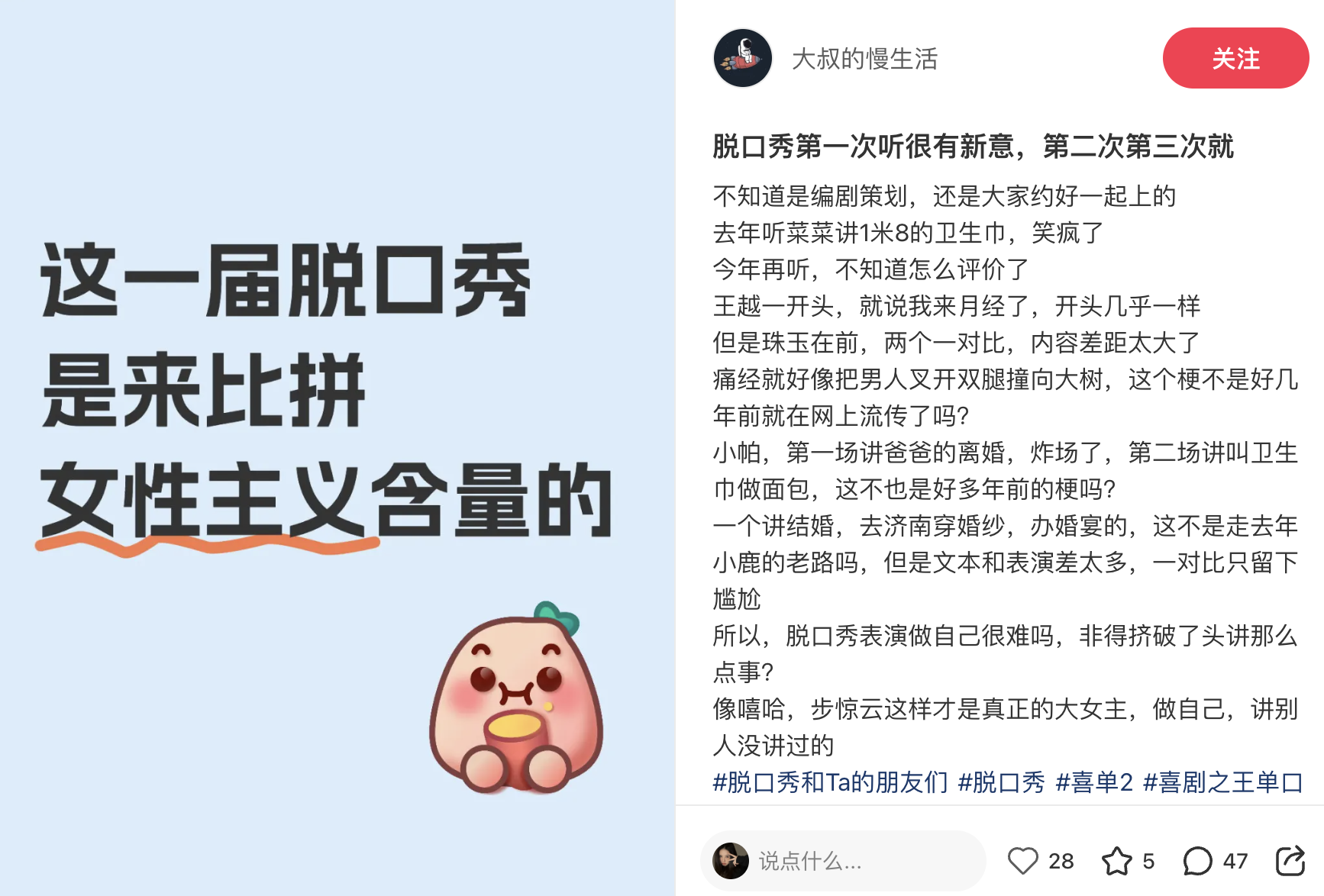 在两档脱口秀综艺节目的左右夹击之下,普通路人根本躲不开这场脱口秀的性别混战。