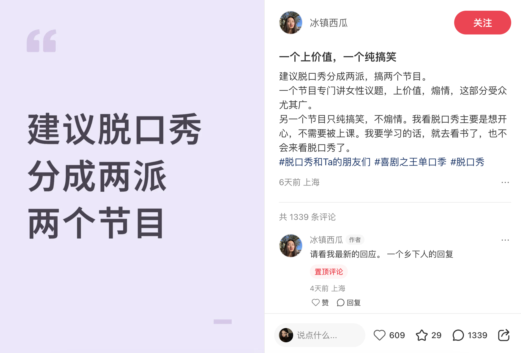 就在罗永浩陷入争议的时候,一位脱口秀男演员在小红书发布了一条内容,大意为“想让脱口秀回到大家都好好讲笑话的时候”,另一位脱口秀男演员在评论区附和“太喜剧了那个时候”。