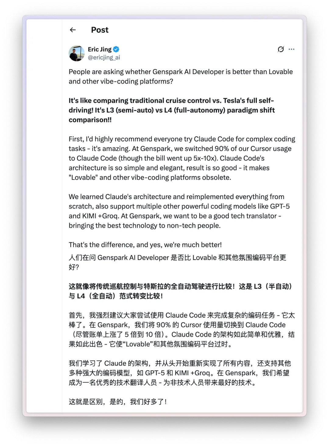 Eric详细解释了和Lovable此类产品的区别,称是L3和L4之间的区别。