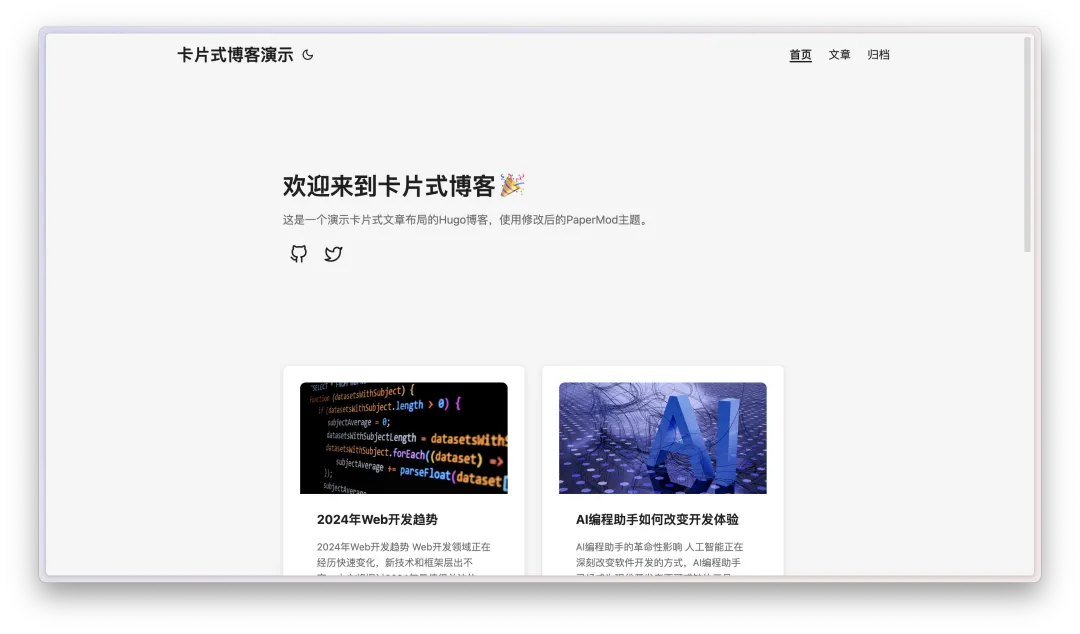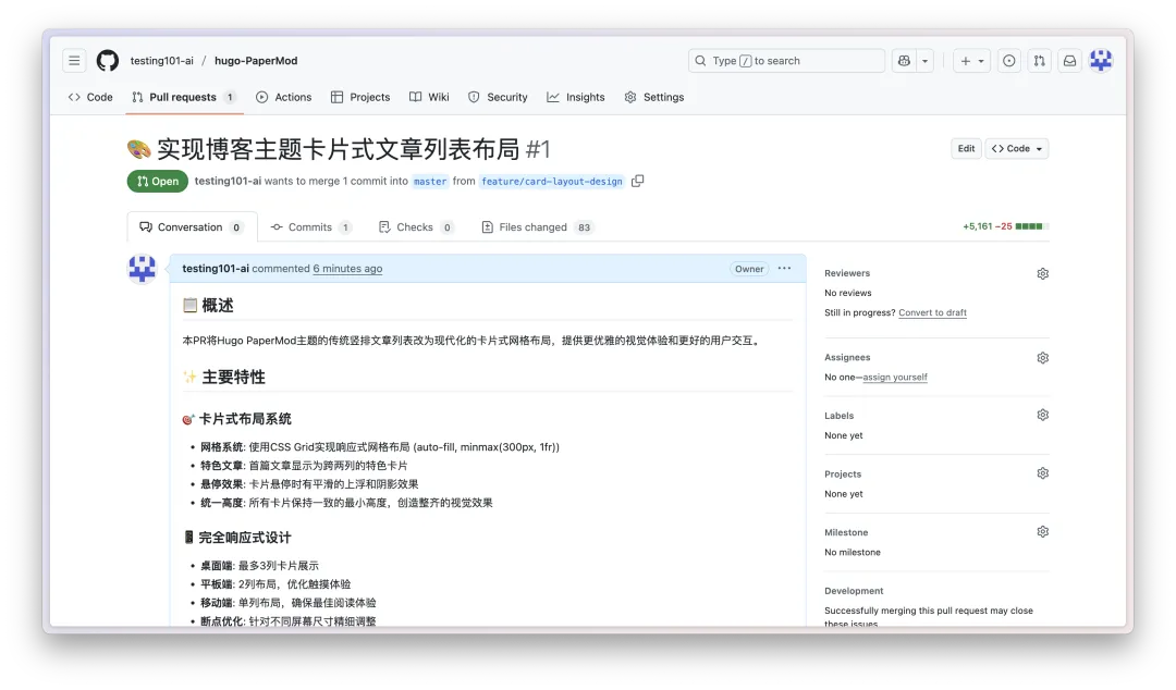 在GitHub集成的测试上,我们首先是fork了一个已经有的Hugo(自搭建静态博客生成器)博客主题模板,然后告诉他把现有主题的列表排放改成卡片式的切换。