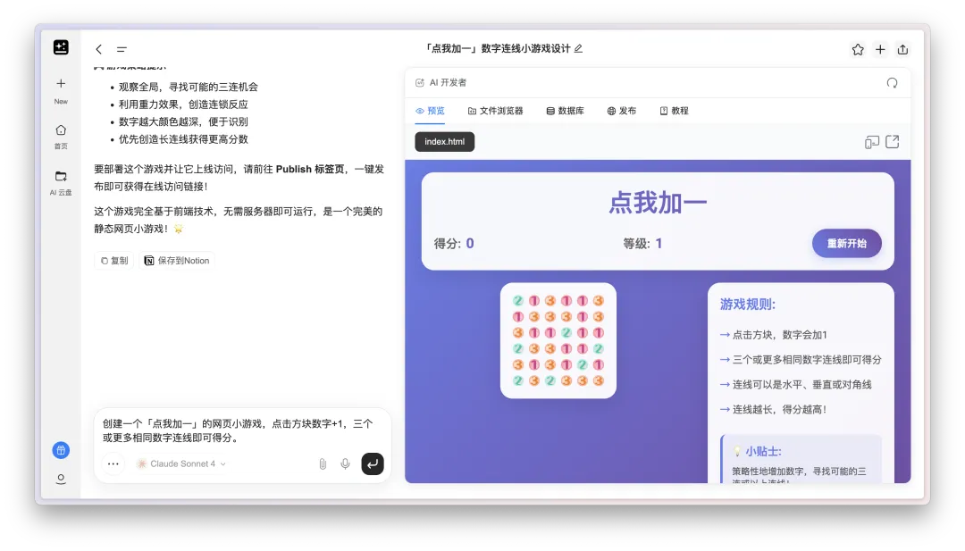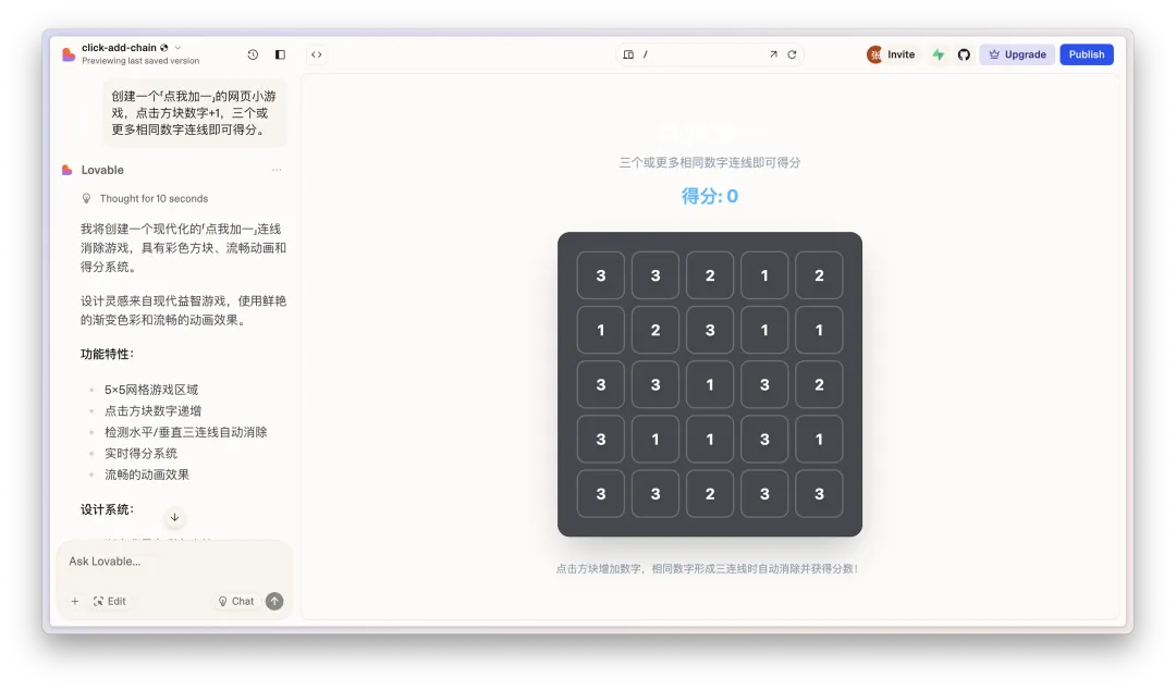 但其实无论是Genspark AI Developer还是Lovable好像都没太清楚游戏的逻辑,也有可能是我输入的提示词不够清楚,毕竟我都没有限制「加一」的次数。