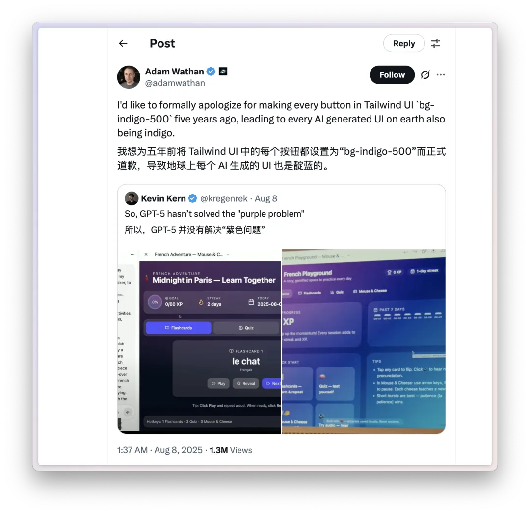 Tailwind CSS(前端框架)创造者Adam Wathan发X解释为什么都是渐变紫。