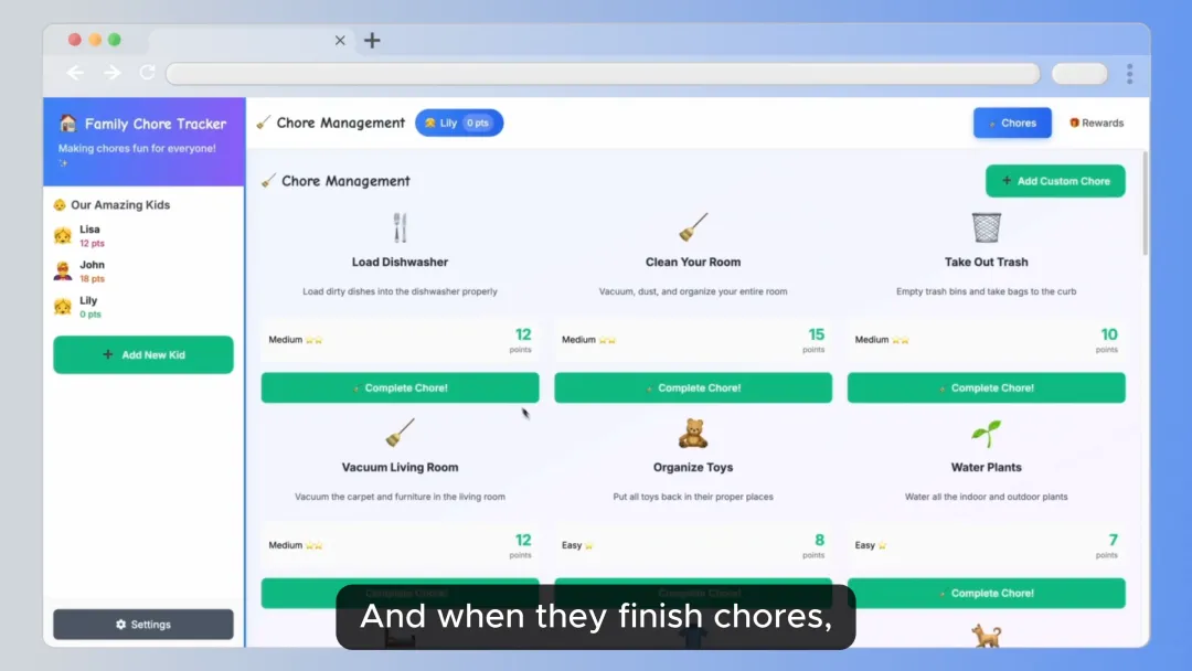 除了预约网站、或者产品信息管理网站,视频里还分享了使用Genspark AI Developer来快速实现个人创意的案例。像是制作一个家务活的管理器,在网页上安排谁今天做什么家务活,完成了还有积分统计和奖励。