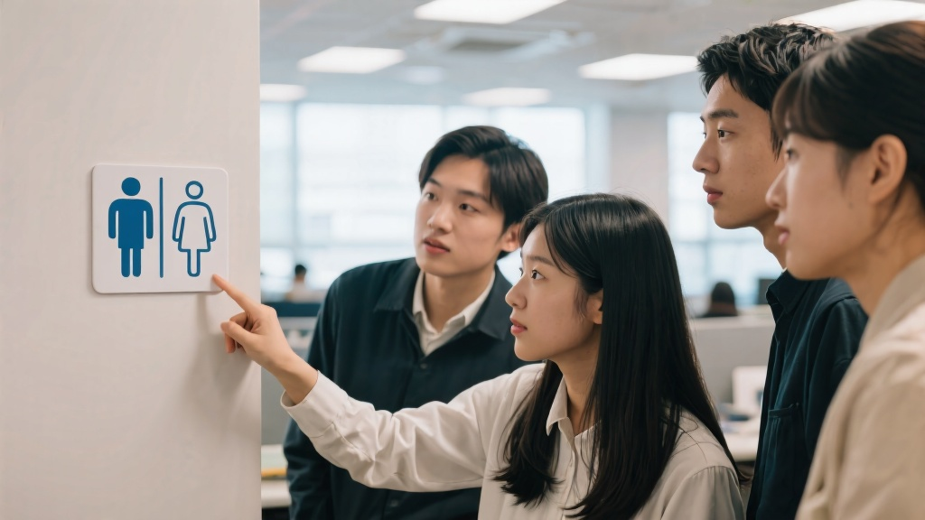 它左边的门上画着高跟鞋,标着“WOMEN”,却有一根手指指向旁边的男厕所门;右边的门上画着男士西装,标着“MEN”,同样有一根手指指向旁边的女厕所门。