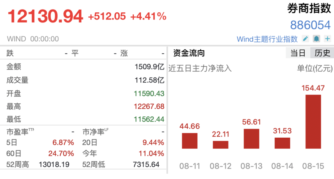 每到A股大涨,券商股率先启动都被视为牛市启动的风向标。也就在8月15日,万得券商指数当日以4.41%的显著涨幅强势收涨,成交额高达1509.90亿元,成交量突破112.58亿股,换手率达4.22%,市场资金对券商板块强烈关注,50只上市券商股实现全线飘红,掀起一波上涨热潮。