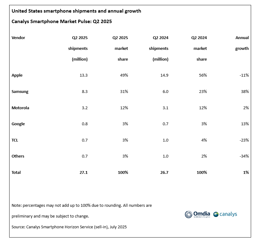 然而,十多年过去了,最近的智能手机销售和出货量数据表明,苹果和三星之间的争斗又卷土重来了。市场研究公司Canalys的数据显示,今年第二季度,三星在美国的发货量激增,市场份额从上年同期的23%飙升至31%。苹果当季的市场份额从56%降至49%。